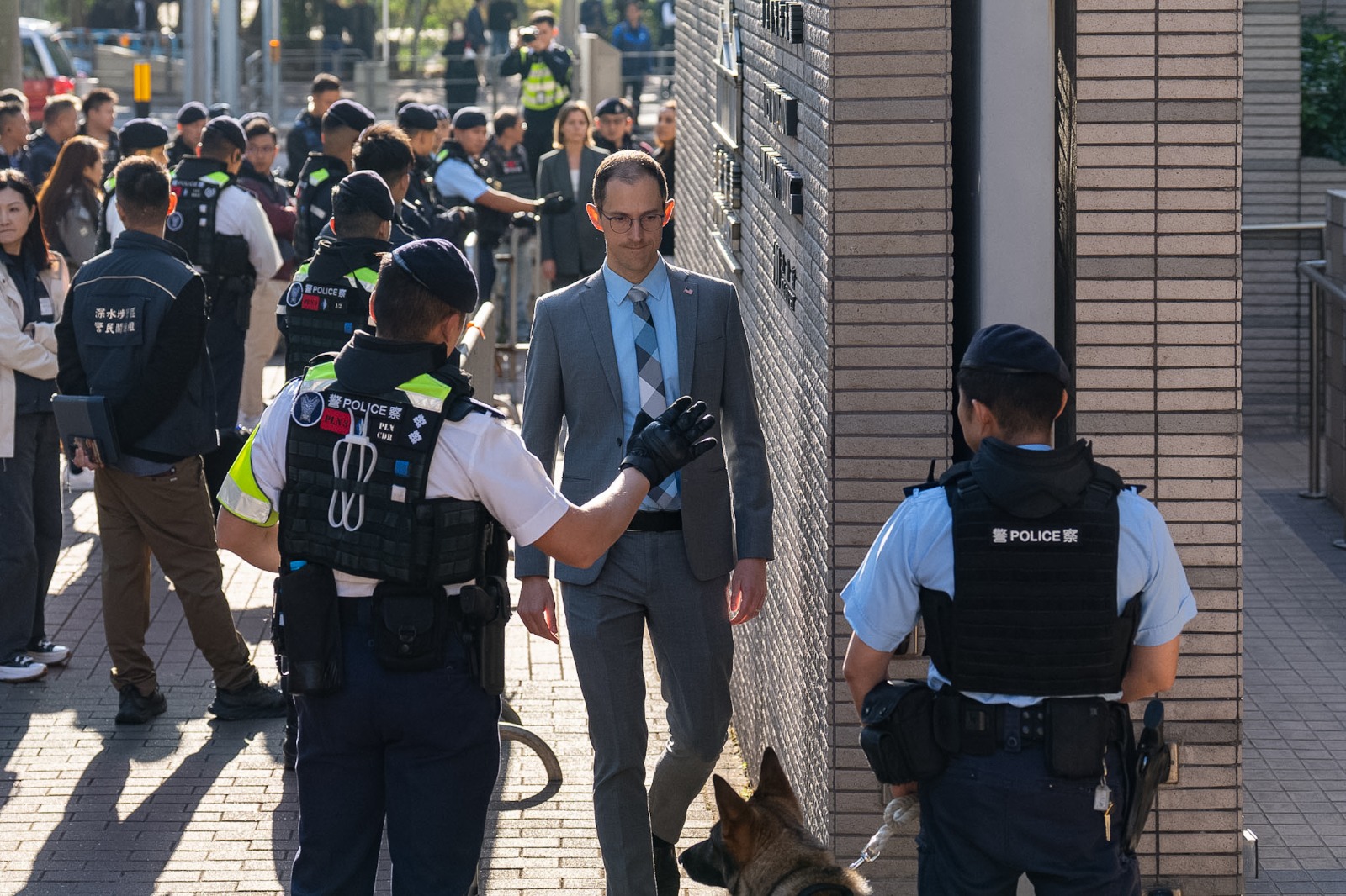 这宗高等法院案件移师西九龙裁判法院审理,早上法院大楼外保安明显加强,停泊多辆警车及“剑齿虎”装甲车,大批警员在附近戒备,亦出动警犬巡逻,截查驶经法院的车辆。