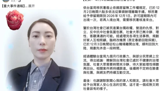 陆配被指宣扬武统遭废居留许可 返陆后批台社会“不健康”