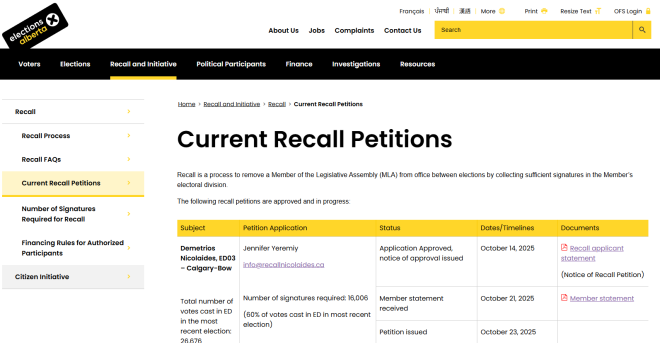 不过,目前这一程序正在阿尔伯塔省以一种引人注目的方式上演。通过公民发起的请愿行动,20名执政的联合保守党(UCP)省议员(MLA)——其中包括省长丹妮尔·史密斯——正面临来自选区选民的罢免请愿。另外,还有一名阿尔伯塔新民主党(NDP)省议员同样遭遇罢免请愿。